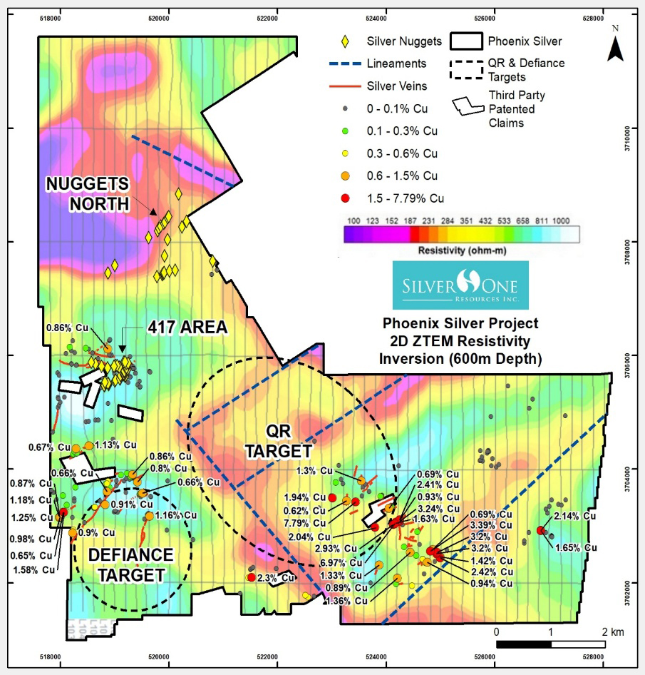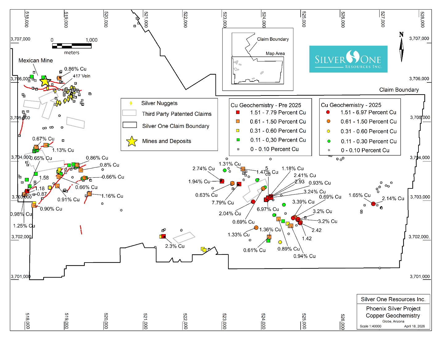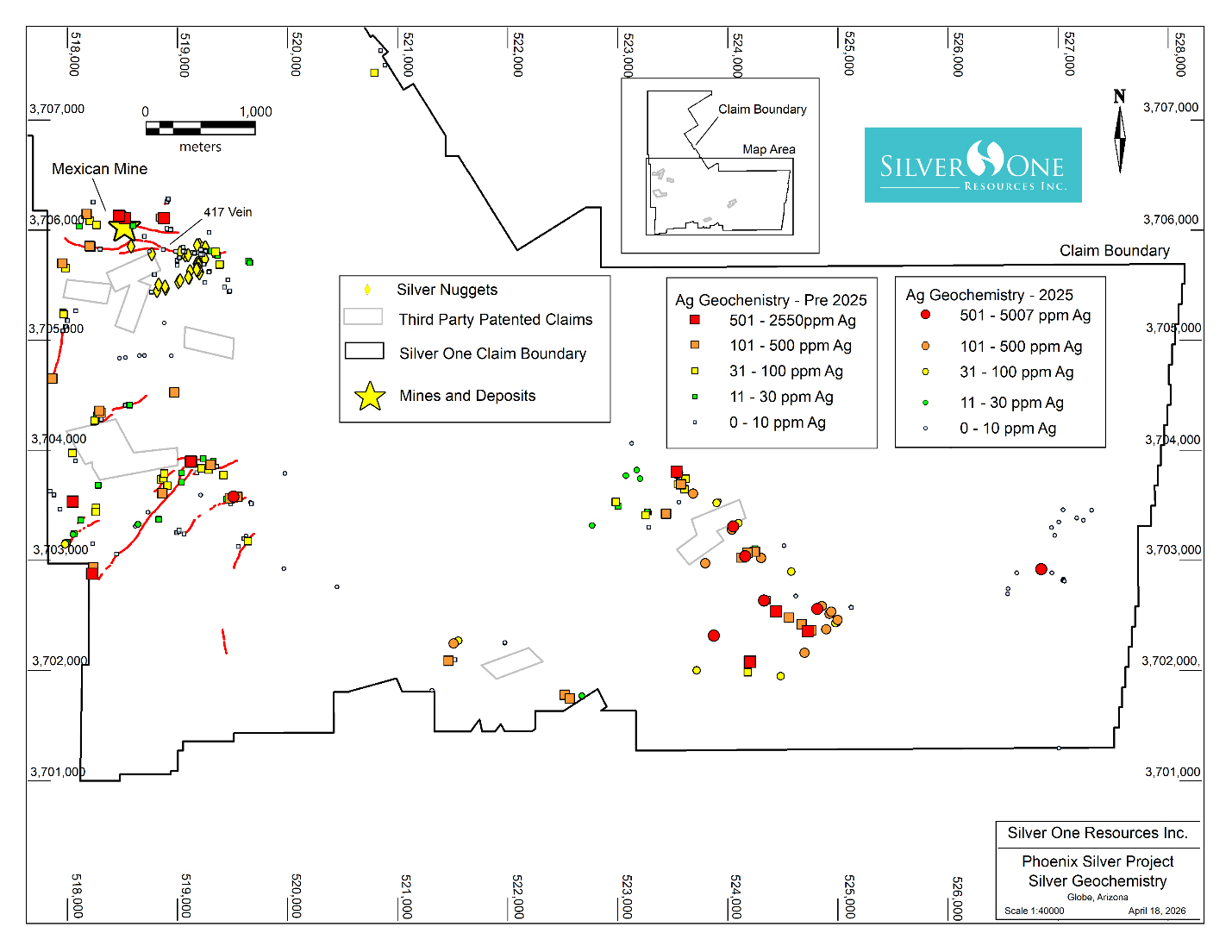 Vancouver, British Columbia – April 28, 2026 – Silver One Resources Inc. (TSXV: SVE; OTCQX: SLVRF; FSE: BRK1) (“Silver One” or the “Company”) reports that surface rock sampling at its Phoenix Silver Project in Arizona continues to yield positive results, with selected samples returning grades of up to 6.97% copper and 5,007 g/t silver (see Table 1, Figures 1 to 3 and the Company’s news releases dated June 6 and May 15, 2024). In parallel, a detailed droneborne magnetometry survey over the 417 area, where the 417 pound silver specimen and multiple other silver fragments have been found, has clearly delineated structural features interpreted as potential controls on mineralization. The Company also provides an update on the groundpenetrating radar (“GPR”) and induced polarization and magnetotelluric (“IPMT”) surveys (see news releases dated December 16 and September 22, 2025).