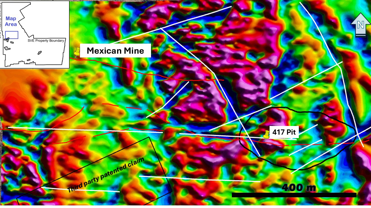 Figure 4. Magnetic vertical derivative map of the 417-Mexican mine area highlighting structural features interpreted from the droneborne magnetometry survey. Red dashed lines are interpreted veins. Heavy black oval shows the area drilled in 2024 where the company plans to conduct a microgravity test survey.
