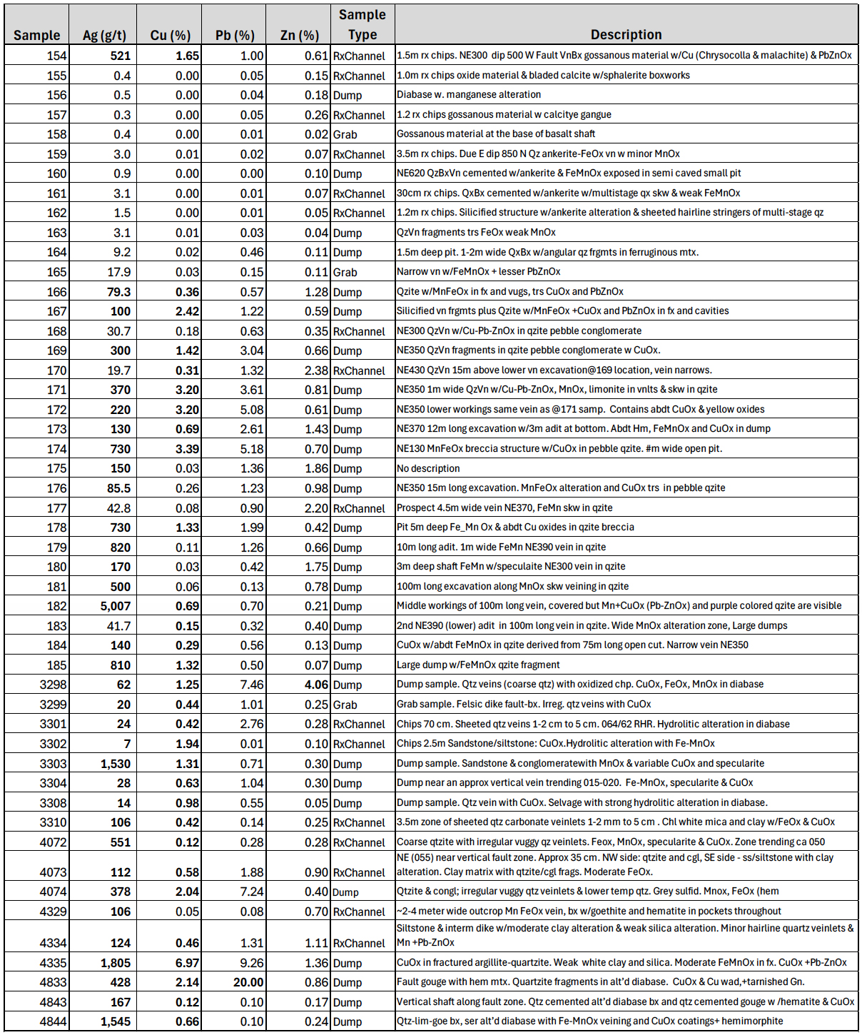 Table 1. Selected assay results from rock samples (selected and chip) collected in the southern part of the Phoenix Silver property during the fourth quarter of 2025. Copper results for selected samples are illustrated in Figures 1, 2, and 3.