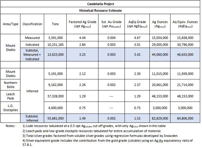 Historical Resource Estimate – Candelaria Project, Nevada