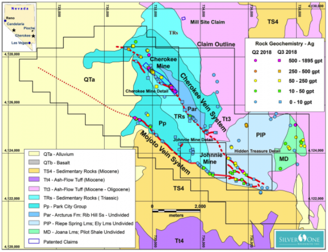 Vancouver, British Columbia–(September 3, 2019) - Silver One Resources Inc. (TSXV: SVE) (OTCQB: SLVRF) (FSE: BRK1) (“Silver One” or the “Company”) is pleased to announce that it has commenced exploration on its 100% owned Cherokee silver-gold-copper epithermal project in Lincoln County, Nevada. Cherokee hosts multiple high-grade epithermal style precious and base metal bearing veins within a system that has been traced for over 11 km along-strike. The Company staked 636 lode claims in 2018 covering the entire known strike-length of the mineralized vein system and entered into a Lease/Purchase Agreement to acquire five patented claims (see the Company’s news releases of July 9 and July 19, 2018 and Figure 1). The Company now controls 100% of the area of known mineralization.