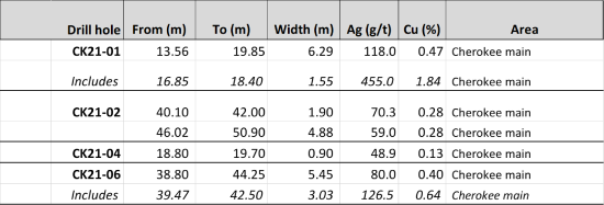 The highest intercepts were around the Cherokee Mine with values in hole CK21-01 averaging 455 g/t silver plus 1.84% Cu over 1.55 meters from 16.85 meters, within a 6.29 meter interval averaging 118 g/t silver plus 0.47% copper from 13.56 meters. Hole CK21-02 intercepted 4.88 meters of 59 g/t silver plus 0.28% copper from 46.02 meters. Hole CK21-06 intercepted 5.45 meters of 80 g/t silver plus 0.40% copper from 38.80 meters. All mineralized intervals occur within 50 meters of the surface. (Figure 1 and Table 1). Drilling around the Cherokee Southeast workings returned anomalous, but low silver and copper values. Drilling immediately to the northwest of the Cherokee workings returned only weakly anomalous silver and copper values. The mineralized intervals are also highly anomalous in zinc and lead.