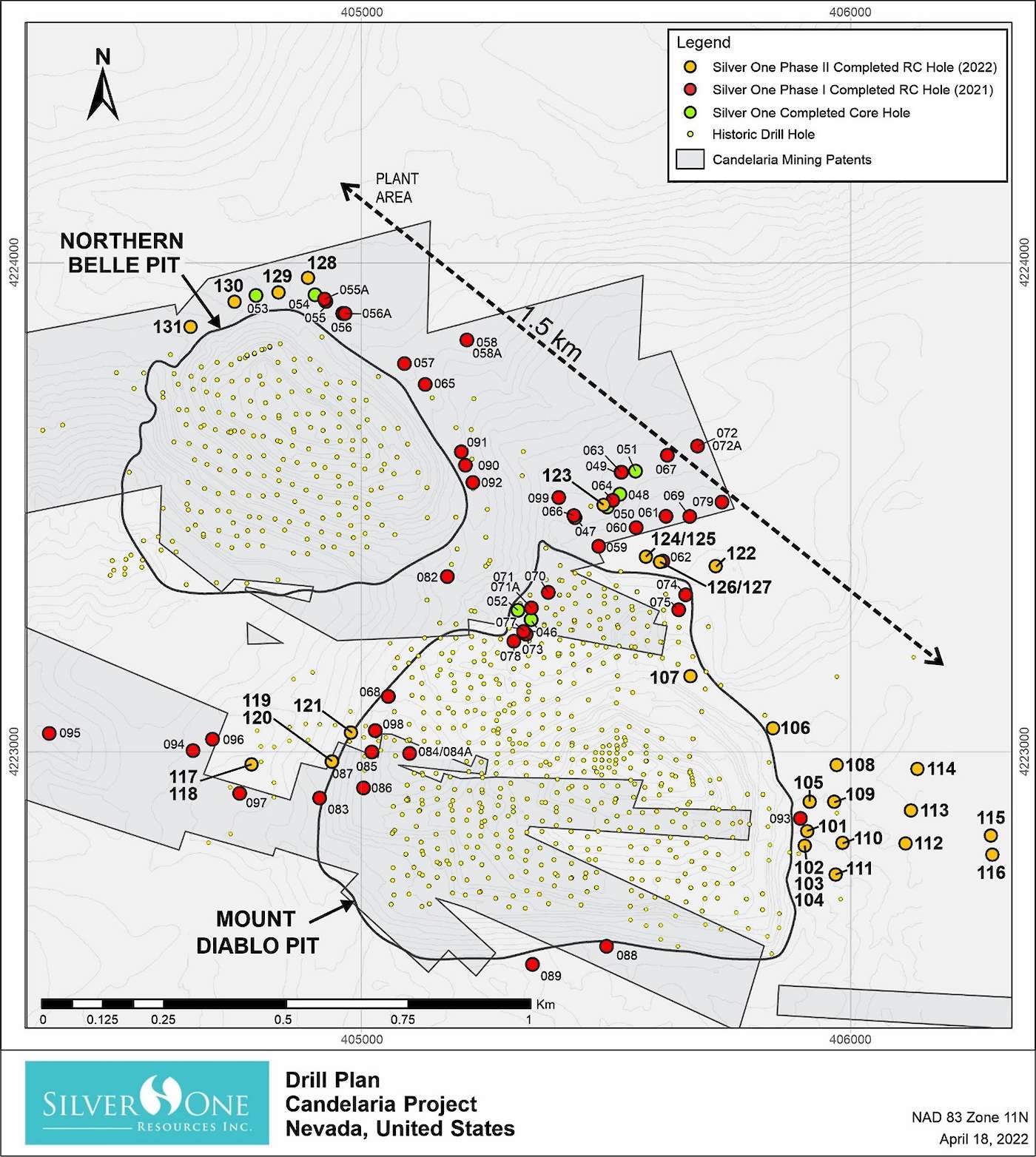 Vancouver, BC – April 25, 2022 - Silver One Resources Inc. (TSXV: SVE; OTCQX: SLVRF; FSE: BRK1 - “Silver One” or the “Company”) announces the completion of Phase II reverse circulation (“RC”) drilling (7,500 m) initiated in January, 2022 and commencement of a 1,500-meter metallurgical core drilling program on its Candelaria Project located in western Nevada, USA.